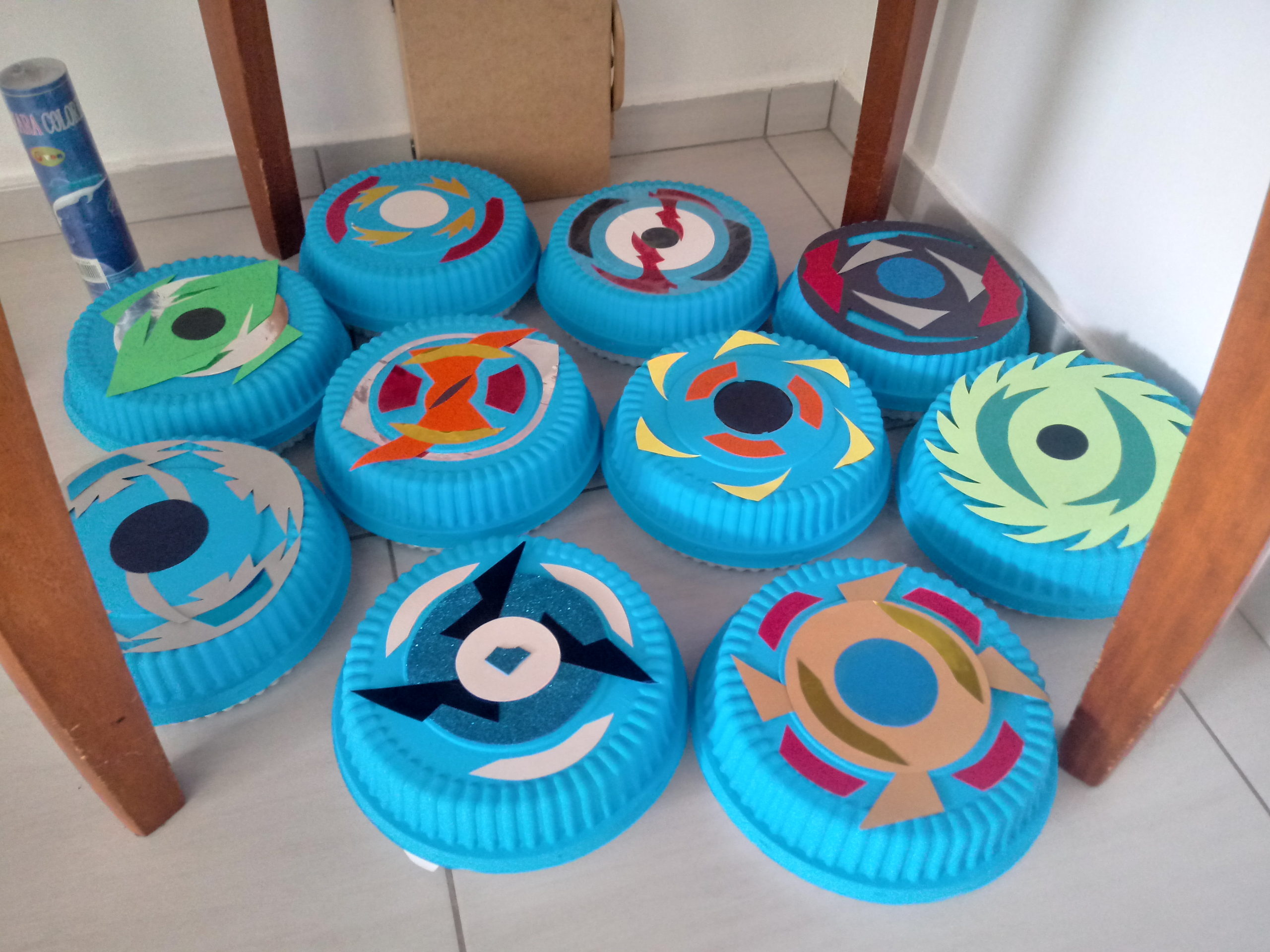 Beyblade com embalagem plástica e pipoca em garrafa pet